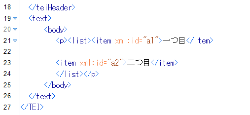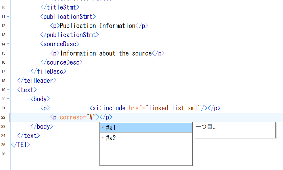 その上で、ファイル中のどこか適切な場所で、<xi:include href="linked_list.xml"/>というタグを入れます。そうすると、linked_list.xmlのなかに含まれているxml:idを参照できるようになります。